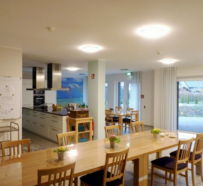 Die Einrichtung Mariengarten bietet Wohnraum für 19 Menschen mit Pflegebedürftigkeit. Zur Sicherstellung des Rechts auf Privatsphäre verfügt jedes Zimmer über rollstuhlgerechte Einzelbäder. Die Einrichtung erstreckt sich über das Erd-, Obergeschoß und den Keller, wobei die Zimmer der Nutzer durch kurze, rollstuhlgerechte Flure mit den Funktions- und Gemeinschaftsbereichen verbunden sind, sodass es den Nutzern leicht fällt, von ihren Zimmern in die Gemeinschaft zu finden. Handläufe und eine indirekte Nachtbeleuchtung in den Fluren bieten zusätzliche Sicherheit. Ein Personenaufzug ermöglicht es den Nutzern sich selbst bei Immobilität problemlos zwischen den Ebenen bewegen zu können.