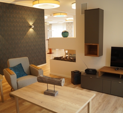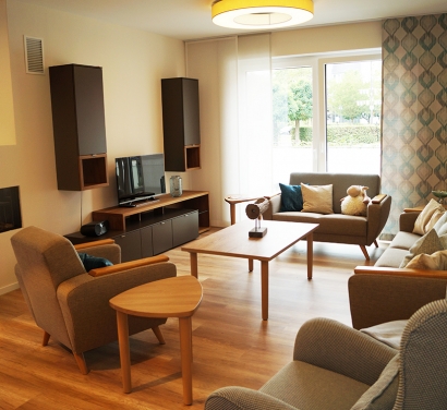 In der Hausgemeinschaft leben16 Menschen auf zwei Etagen. Alle Räume und Sanitärbereiche sind barrierefrei ausgestattet, die verschiedenen Etagen werden bequem über einen Fahrstuhl erreicht.
