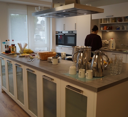Der Alltag der Hausgemeinschaft spielt sich im großen Gemeinschaftsbereich mit Küche, Wohn- und Esszimmer auf der jeweiligen Wohnebene ab. Die Menschen kommen hier gerne zum Kochen, Essen, Spielen und Klönen zusammen.