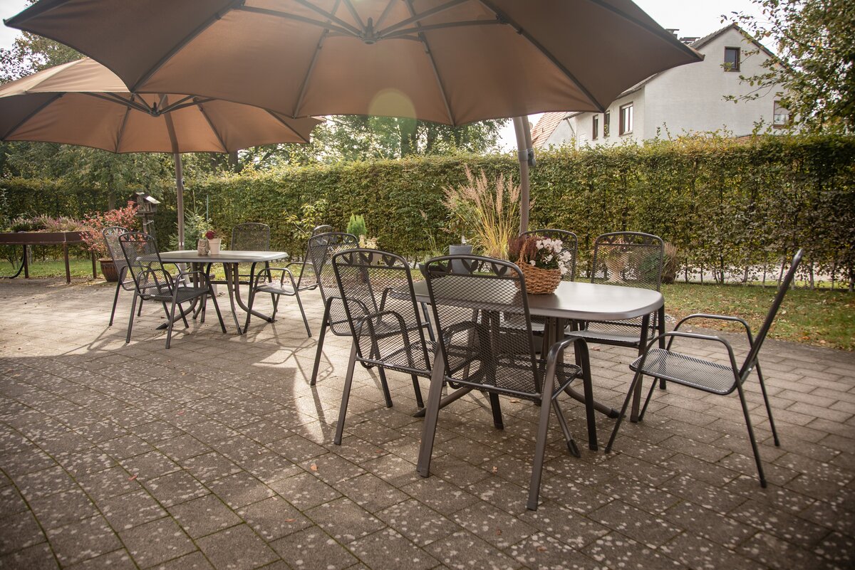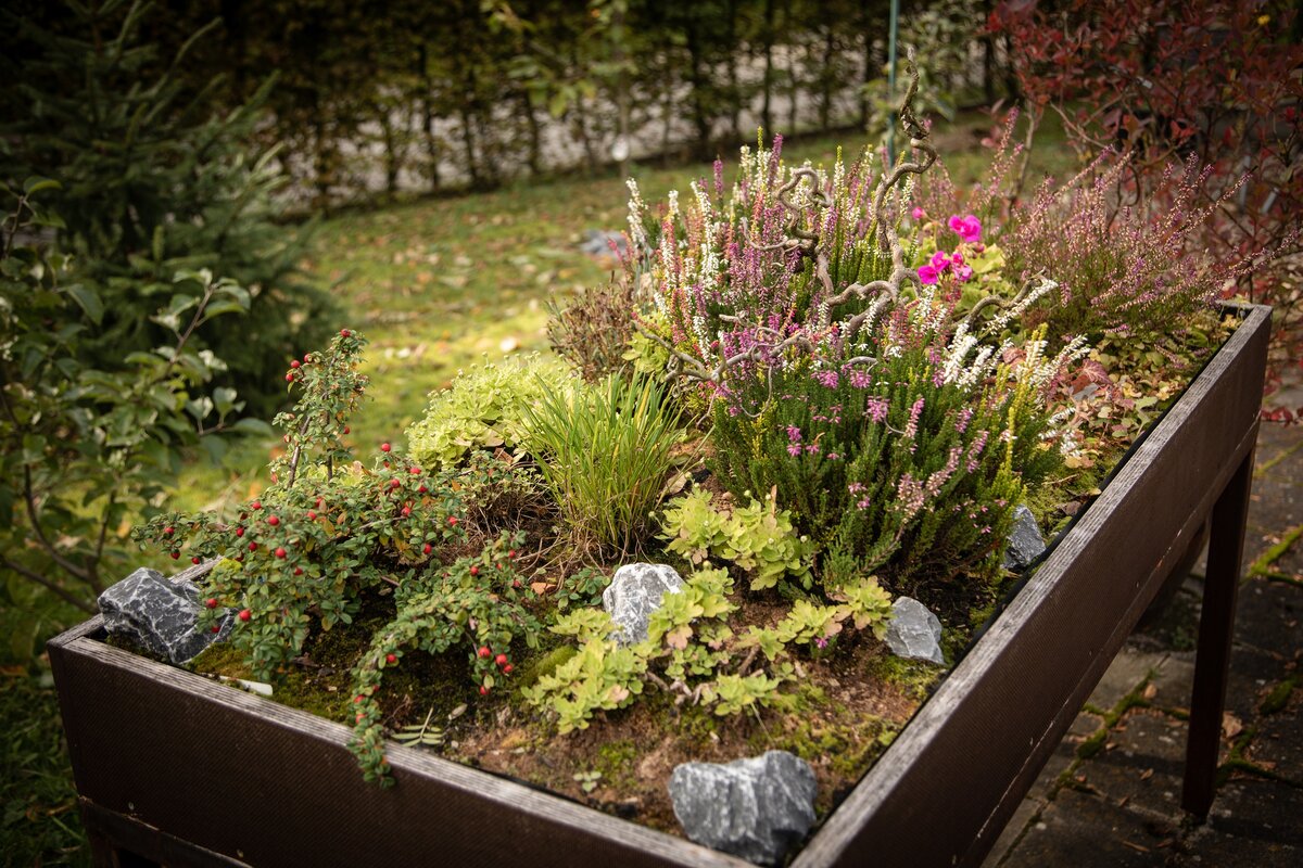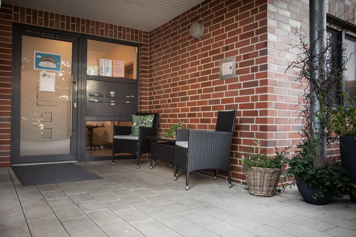 Das Gemeinschaftsleben des Hauses pulsiert in den zwei zentralen Aufenthalts- und Gemeinschaftsräumen im Erd- und Obergeschoss. Beide werden von den Bewohnerinnen und Bewohnern gern tagsüber besucht und für unsere Gemeinschaftsveranstaltungen wie Sport, Spiele, Geburtstagsfeiern oder Andachten genutzt. Der Gemeinschaftsraum im Obergeschoss verfügt über einen Balkon. Der Gemeinschaftsraum im Erdgeschoss öffnet sich zu einem Garten mit zwei Terrassen. Sie sind in der warmen Jahreszeiten wie ein zusätzlicher Wohnraum und werden viel genutzt, beispielsweise zum Entspannen aber auch für Grillfeste. Natürlich sind die Bewohnerinnen und Bewohner herzlich dazu eingeladen, den Garten mitzugestalten. In gut zugänglichen Hochbeeten oder in Töpfen werden nicht nur duftende Blumen sondern auch knackiges Gemüse gezogen. Letzteres findet dann den Weg in die Gemeinschaftsküche, in der täglich frisch gekocht wird. Auch die Lieblingsgerichte der Bewohnerinnen und Bewohner finden sich regelmäßig in den Speiseplänen wieder.