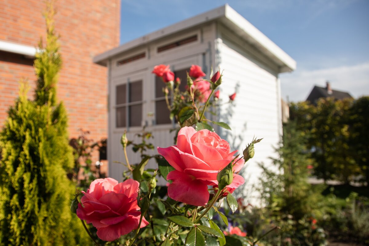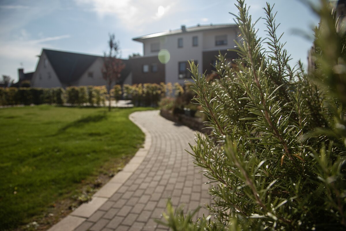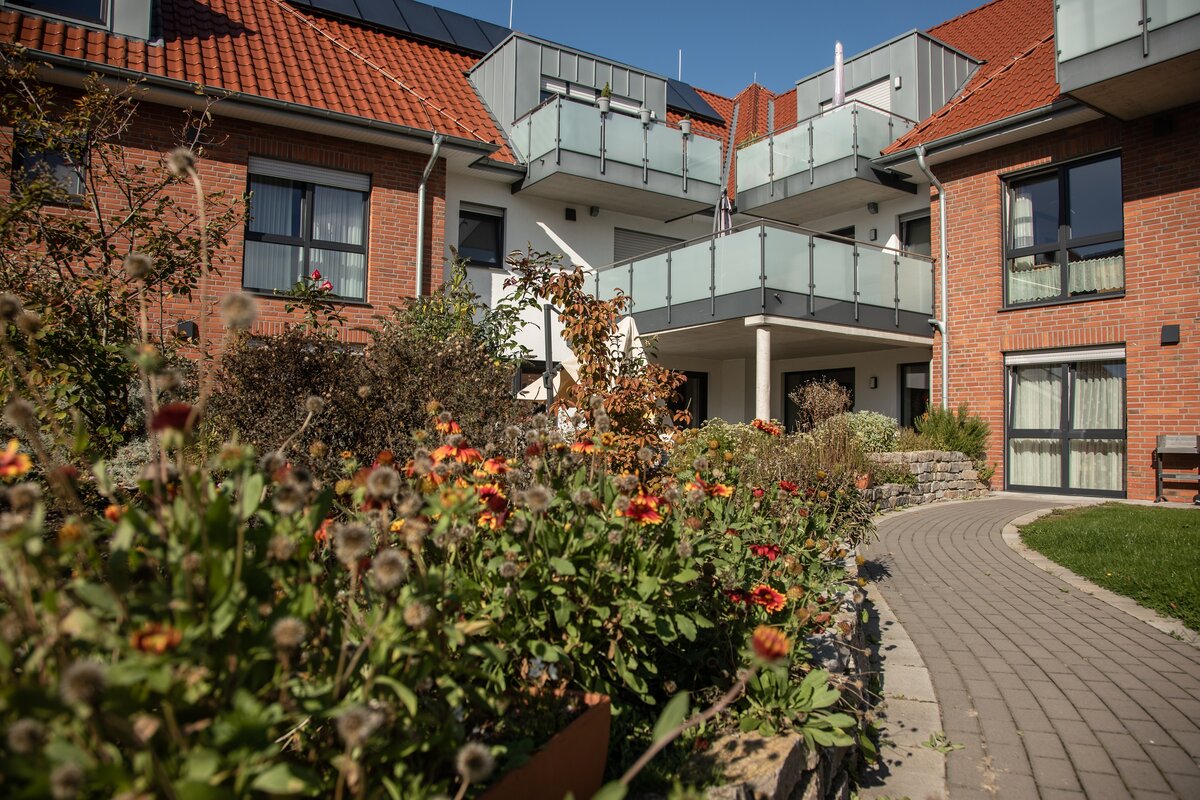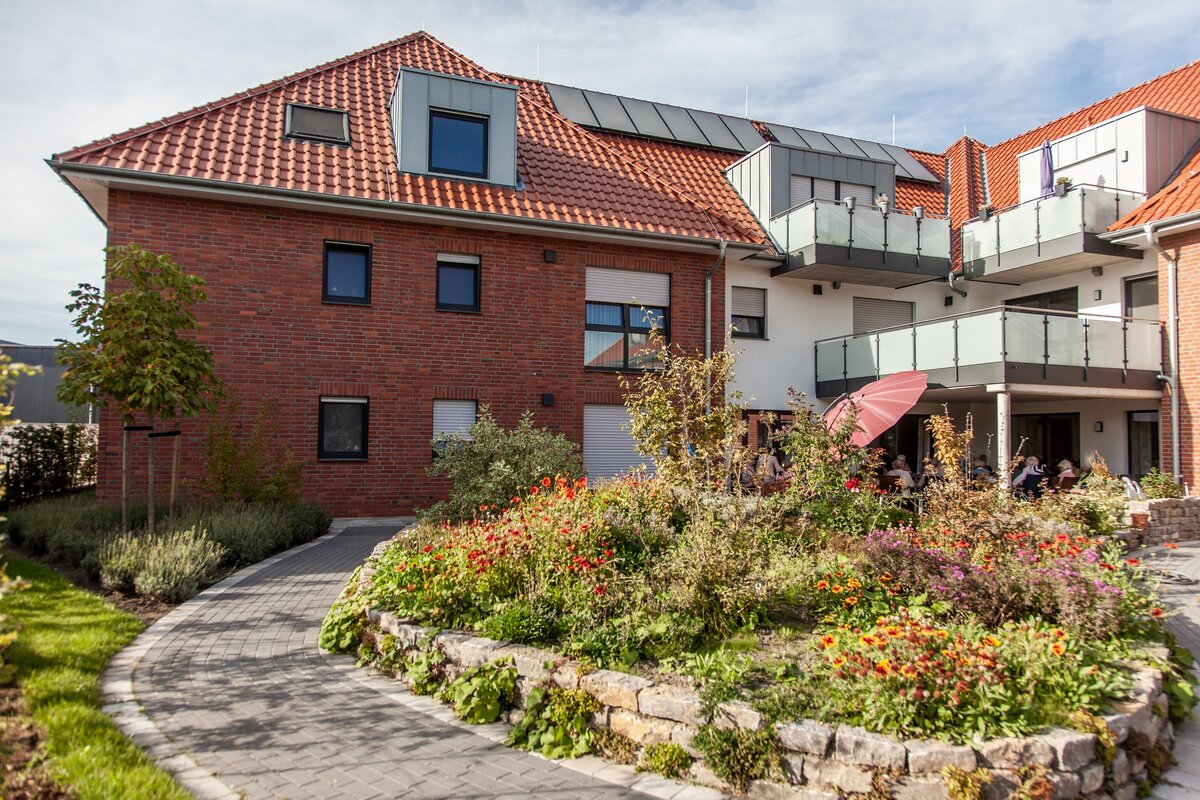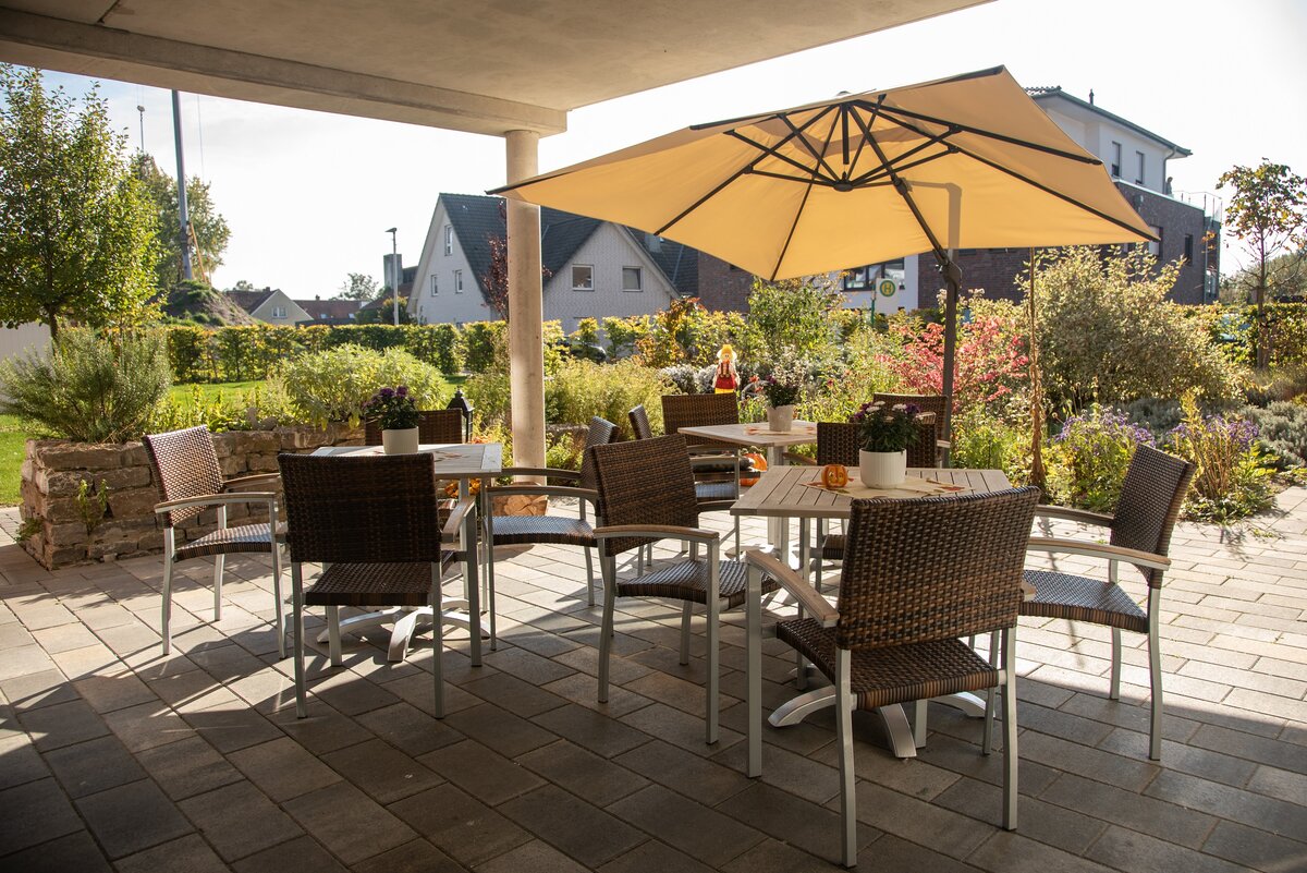 Die überdachte Terrasse öffnet sich zu einer parkähnlichen Gartenanlage. Frei gestaltbare Bereiche des Gartens lassen den Bewohnerinnen und Bewohnern Raum für eigene Kreativität.