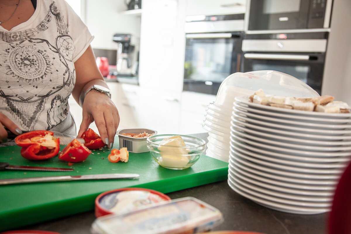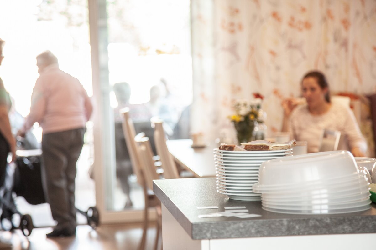 Im Erdgeschoss befindet sich die gemeinschaftliche Wohnküche, die offen und großzügig angelegt ist. Dort können die Bewohnerinnen und Bewohner mit Unterstützung der Hauwirtschaftskraft kochen und im angrenzenden Essbereich gemeinsam essen.